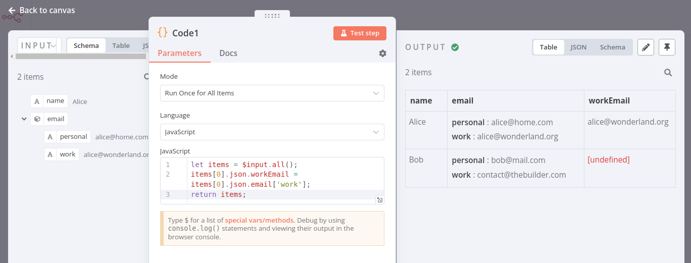 Let's build on the previous exercise, in which you used the Code node to create a data set of two contacts with their names and emails. Now, connect a second Code node to the first one. In the new node, write code to create a new column named workEmail